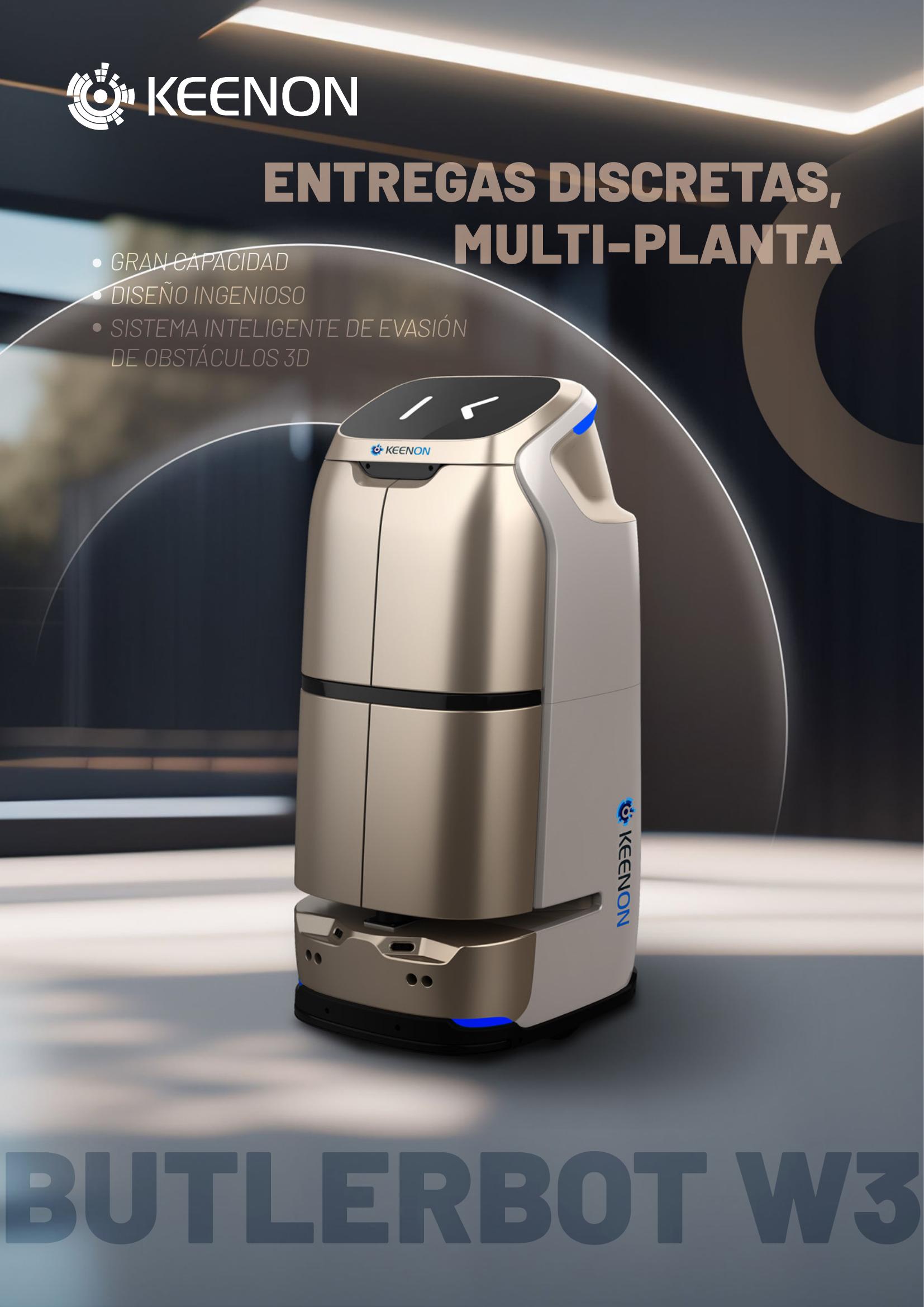 Robot para servicio de mesero o repartidor W3LS diseñado para hoteles y hospitality, con capacidad de operación autónoma en elevadores y navegación multi-piso. Ideal para delivery en entornos de múltiples niveles.