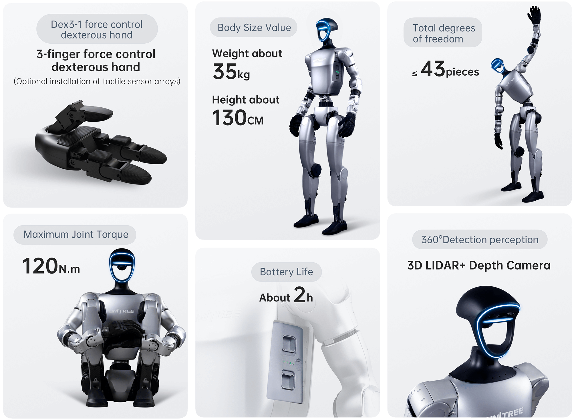 Robot Humanoide Biónico con inteligencia artificial y reconocimiento de humanos. Cámara 3D lidar + Cámara de profundidad, bocina y micrófono, movilidad de hasta 2 m/s, hasta 2 horas de uso, sistema de enfriamiento y control manual. Extension de brazo: 0.45m. Longitud de pantorrilla + muslo: 0.6m. Torsión máxima de la articulación de la rodilla: cerca de 2Kg. Hasta 23 grados de libertad. Par máximo de articulación: 90 N.m. Espacio de movimiento conjunto extra grande: Articulación de la cintura: Z±155°, Articulación de rodilla: 0~165°, Articulación de la cadera: P±154°、R-30~+170°、Y±158°.