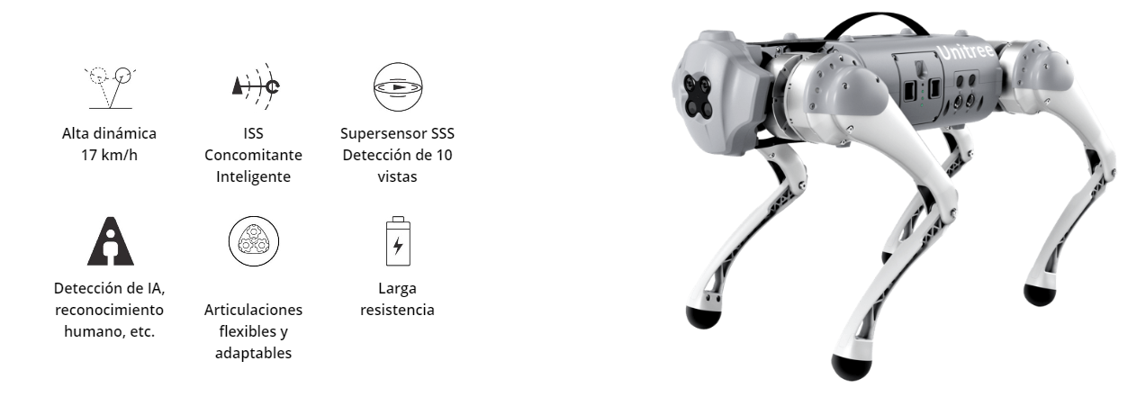 Perro Robot Biónico para inspección con inteligencia artificial, reconocimiento de humanos. Incluye 1 control remoto, tareas programadas y cámara integrada. Sistema Concomitante Inteligente de la ISS (ISS - Intelligent Sidekick System) que adopta la tecnología patentada de posicionamiento y control de vectores inalámbricos. El robot está en la visión periférica lateral de la persona, es mejor que el modo de seguimiento convencional con una interacción natural entre el ser humano y el ordenador, segura y protegida. No es necesario mirar siempre hacia atrás y preocuparse por si el robot se pierde o encuentra obstáculos. Cuando el entorno es complejo, las personas pueden elegir activamente una ruta más sencilla para ayudar al robot a pasar. Motor robusto y fiable con articulaciones flexibles y adaptables. El nuevo diseño patentado de articulaciones de potencia ultraligeras, silenciosas y de larga duración. Go1 con Super AI Hash Rate incorporada: CPU superior de 16 núcleos + GPU (384Core, 1,5TFLOPS).